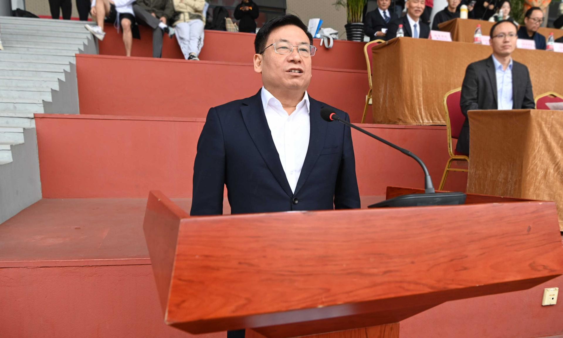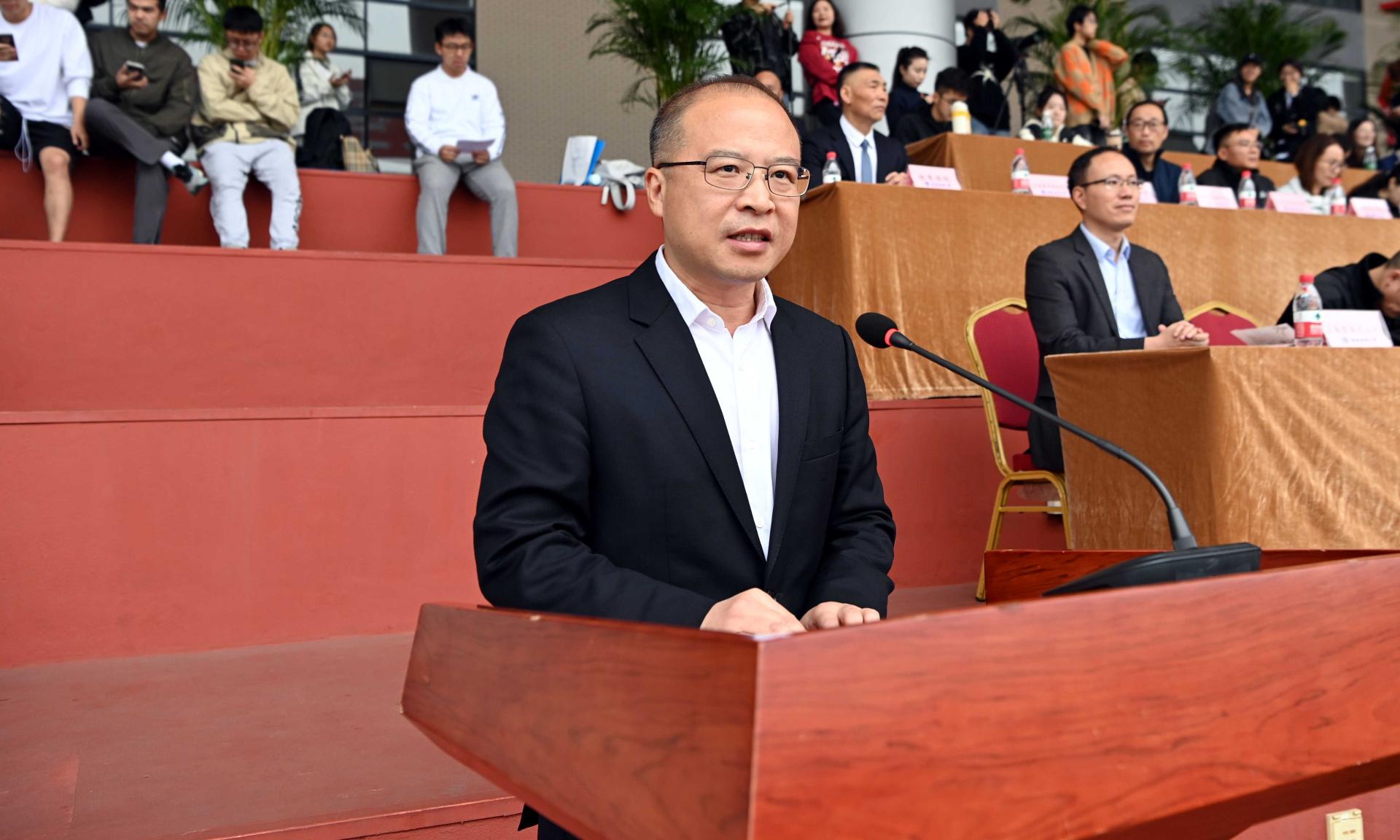 26日8时30分,运动会在晨曦运动场举行。赵德武宣布运动会开幕,李永强致开幕辞。李永强指出,体育是社会发展和人类进步的重要标志,承载着国家强盛和民族振兴的梦想;体育也是全面落实立德树人根本任务的基础性工程,在“五育并举”中前承德智、后接美劳,是承前启后的关键一环。学校高度重视体育工作和学生健康成长,把体育当作培养卓越人才的沃土,坚持“健康体育、快乐体育、终身体育”理念,着力构建“1+3LEwin乐玩模式”,形成了“一校多品、一院一品、一社一品”体育教育新格局,实现了师生“育体”和学校“育人”的有机结合。李志生主持开幕式。