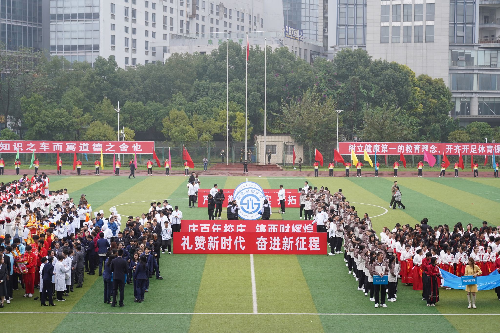 11月6日—11月7日,学校2025年秋季运动会在柳林校区举行。运动会以“礼赞新时代·奋进新征程,庆百年校庆·铸西财辉煌”为主题,党委书记赵建军,党委副书记、校长李永强等全体校领导,各职能部门和学院(研究院)负责人参加开幕式。