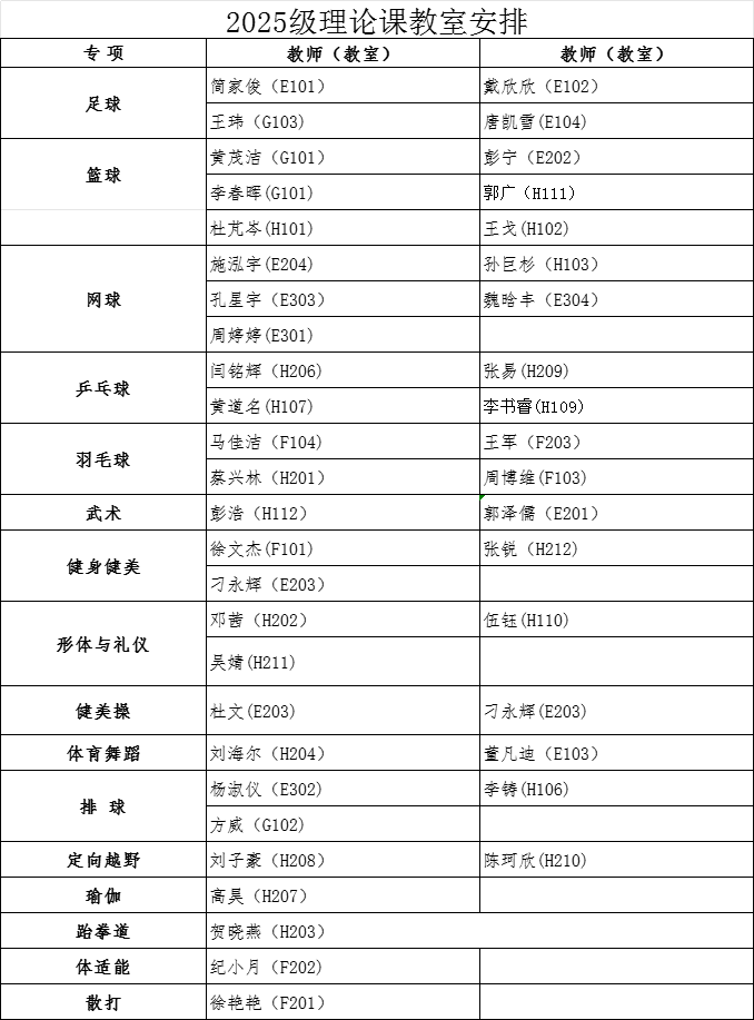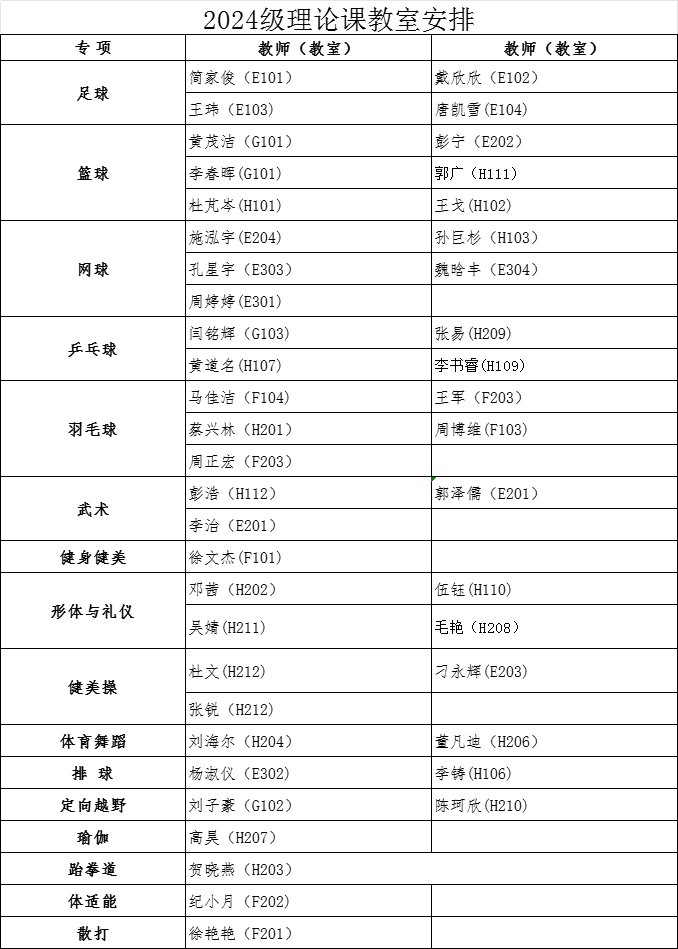 经教务处同意,本学期2024级、2025级本科生第13周体育课为LEwin乐玩理论课,12月8日起恢复户外教学。根据教室资源状况,现将理论课具体安排通知如下:
